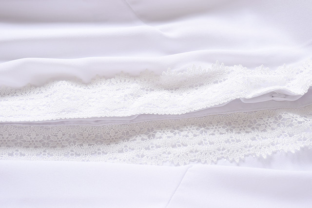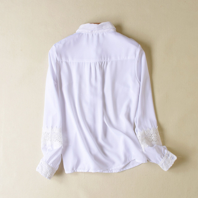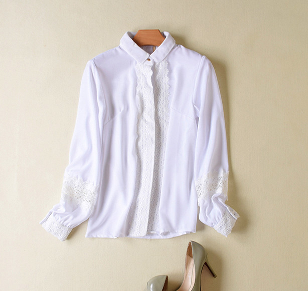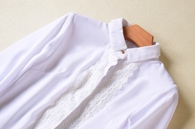 Біла блузка сорочка виготовлена з креп-шифону, невеликий округлий комірець із велюрової тканини, спереду потайна застібка прикрашена мереживом. Манжети з мереживом, на рукавах мереживні вставки.