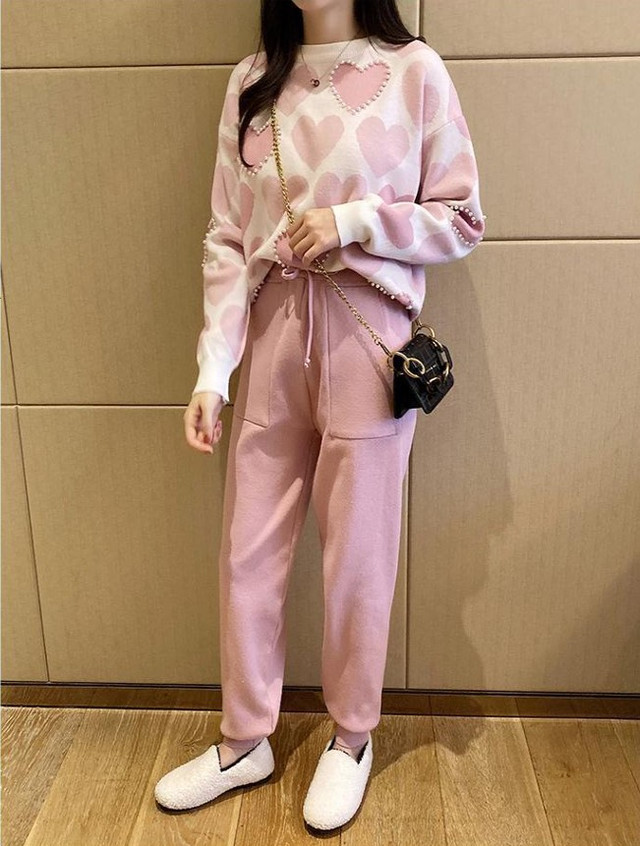 Светр ефектно прикрашений намистинами з бісеру, штани на кулісці з накладними кишенями.