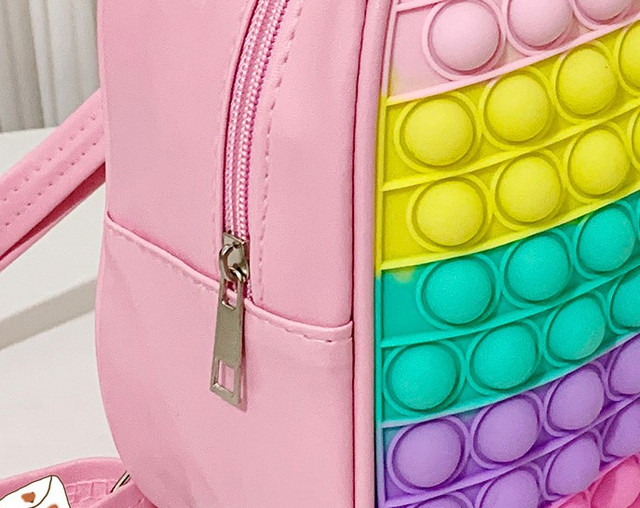 Дитячий рюкзак антистрес для дівчинки з Pop it і вушками зайчика. Рюкзак виконаний виконаний з м'якого кожзам, яскраві кольори, спереду пупырка антистрес райдужна. Ззаду лямки рюкзака, які регулюються під дитину, рюкзак на блискавці, всередині на підкладці.