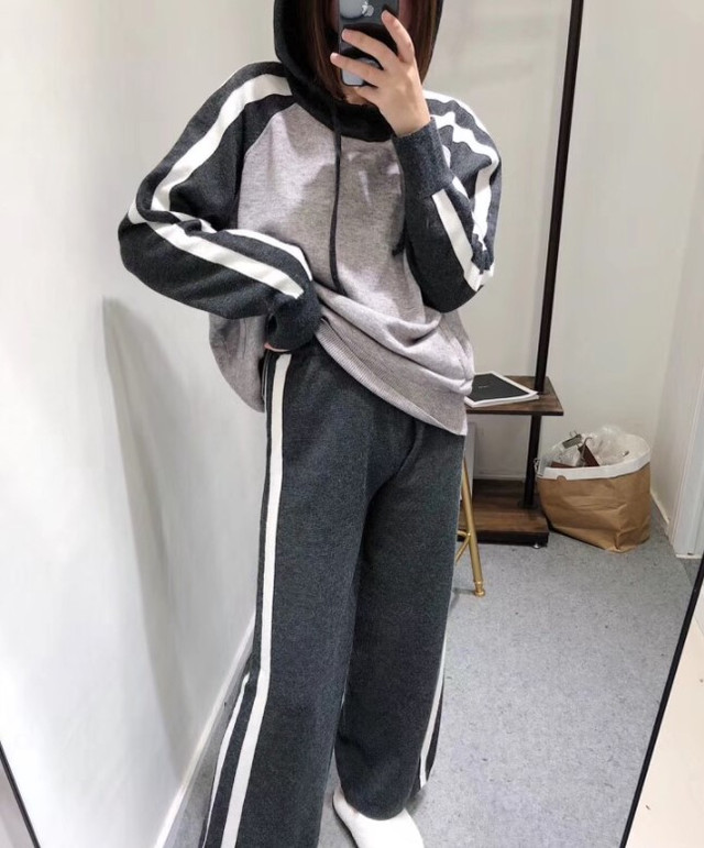 Теплий в'язаний жіночий костюм з широкими штанами і капюшоном